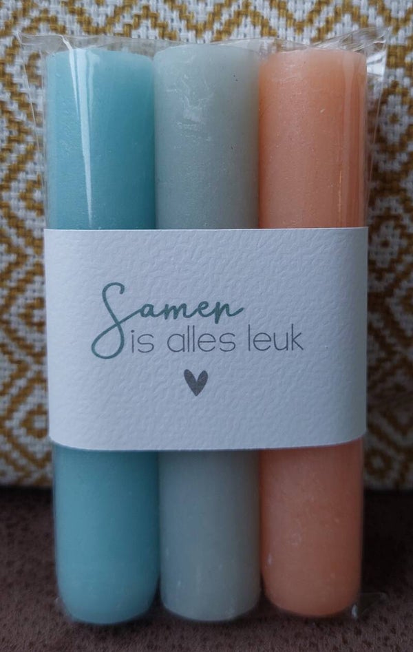 Een setje kaarsen 11 cm. Ze hebben een wikkel met een boodschap.