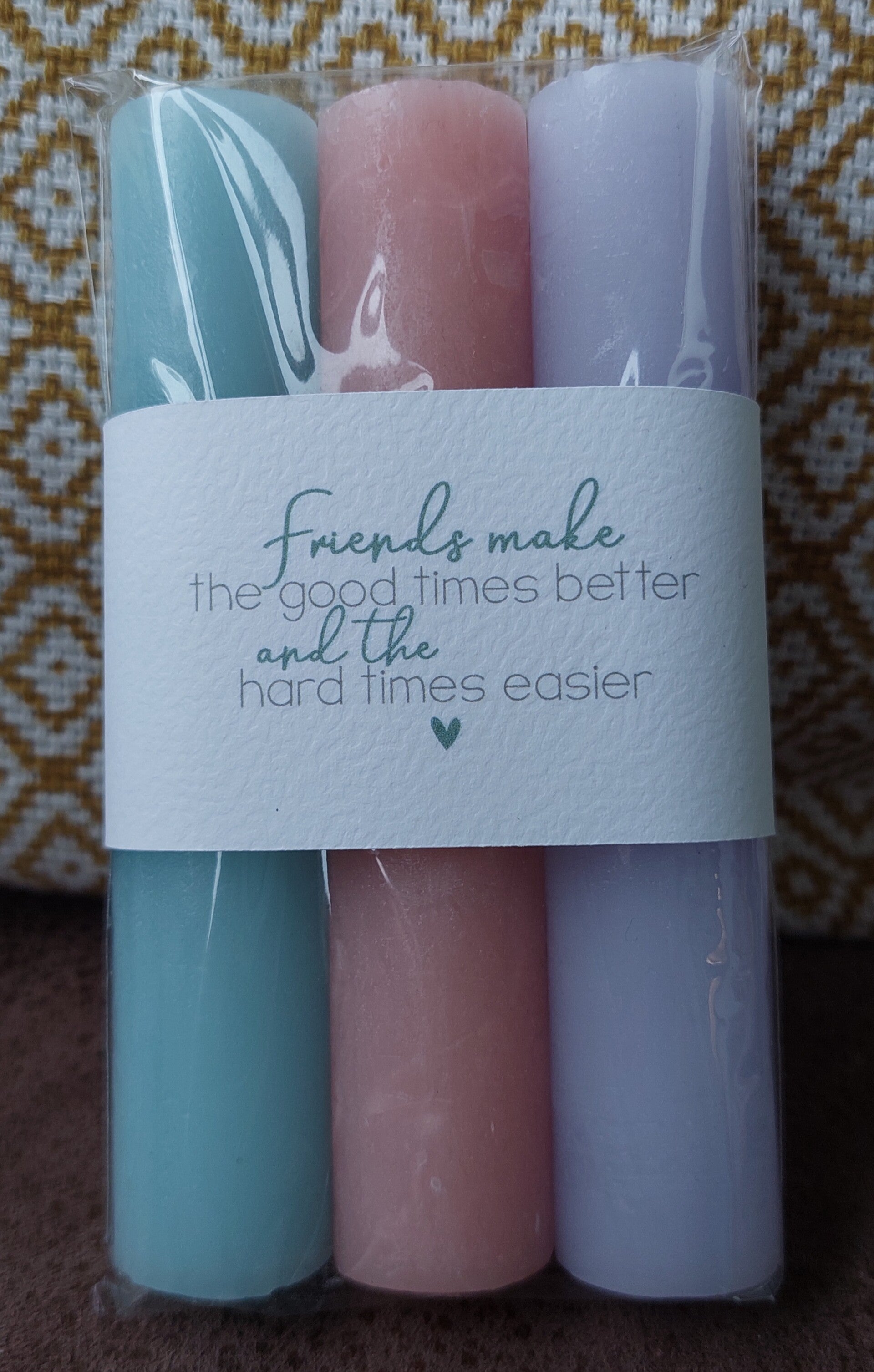 Een setje kaarsen 11 cm. Ze hebben een wikkel met een boodschap.